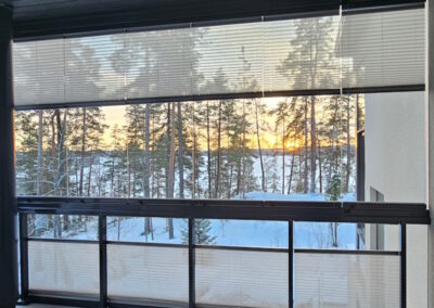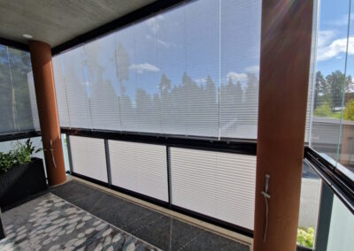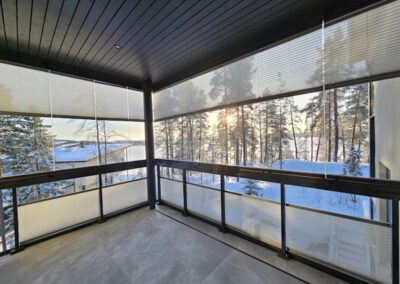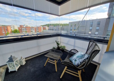 Kaidekaihtimet yhdistävät modernin ulkonäön ja käytännöllisyyden. Ne on helppo säätää juuri sopivaan asentoon, jolloin valon ja yksityisyyden määrä on aina hallittavissa. Lasikaiteellinen parveke saa suojaa ilman, että näkymät katoavat kokonaan – kaihtimet jättävät tilan avaraksi ja viihtyisäksi.