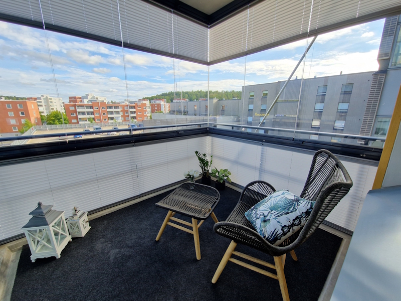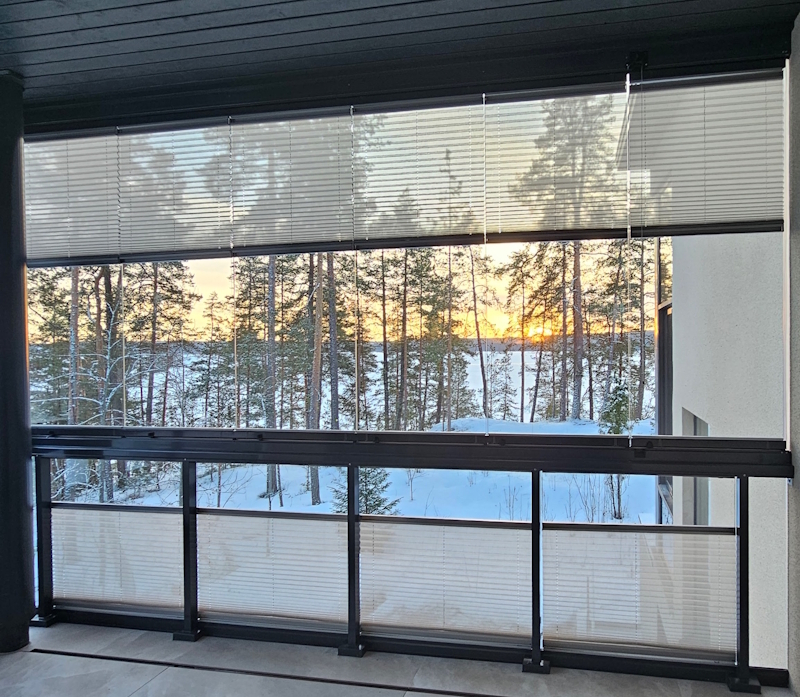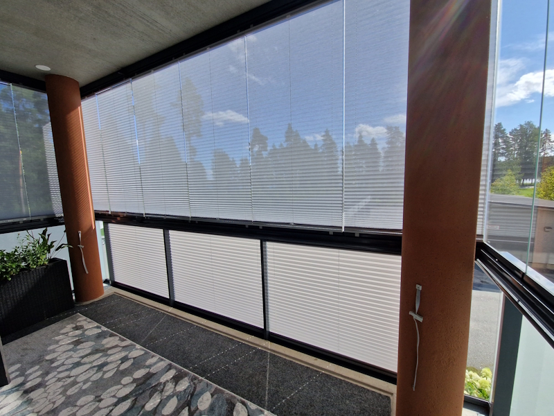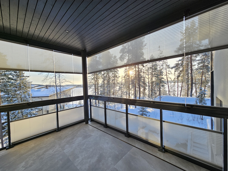 Kaidekaihtimet yhdistävät modernin ulkonäön ja käytännöllisyyden. Ne on helppo säätää juuri sopivaan asentoon, jolloin valon ja yksityisyyden määrä on aina hallittavissa. Lasikaiteellinen parveke saa suojaa ilman, että näkymät katoavat kokonaan – kaihtimet jättävät tilan avaraksi ja viihtyisäksi.